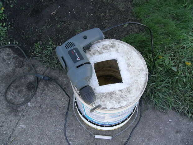 Con un cepillo de alambre en el taladro o papel de lija hacer áspera el área de una pulgada o tan alrededor del perímetro del corte área.  Esto permite mejorar la adherencia del pegamento gorila al plástico.   Después de hacer esto si el cubo está sucio como el mío es un buen momento para limpiarla.