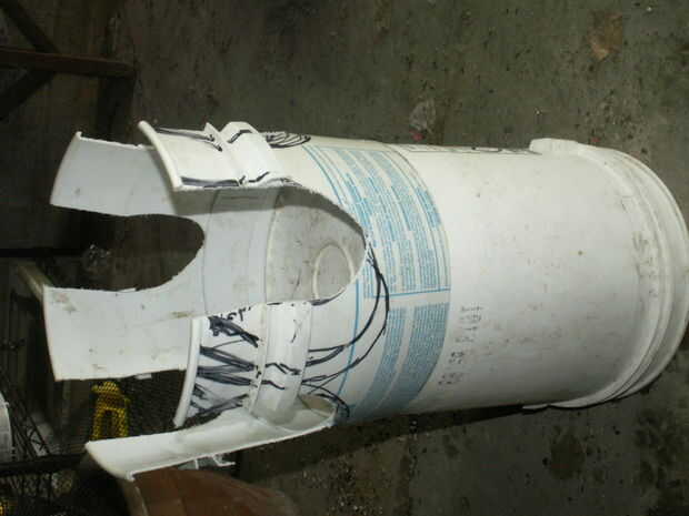 OK ahora tienes tus piernas, con un cubo en la parte superior, así que toma ese pedazo de la parte inferior usted corta y perforar los agujeros en y cae justo en la parte superior de su otro cubo, esto asentará sobre 3-5 pulgadas forma el fondo de la compostera, para que ahora tenga un espacio que actúa como un bien asegurándose de que tiene gran drenaje para sus gusanos no se ahoguen.