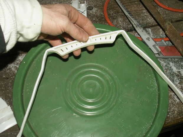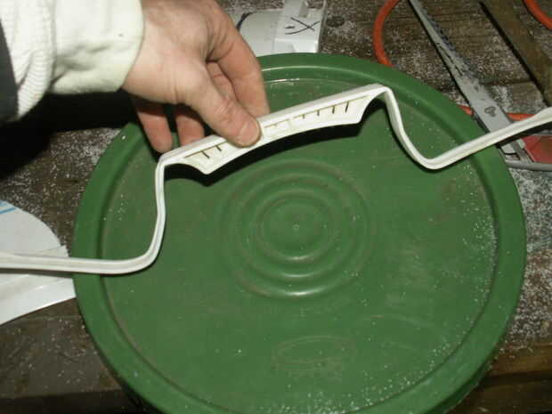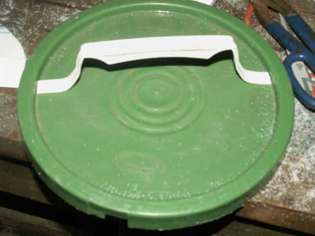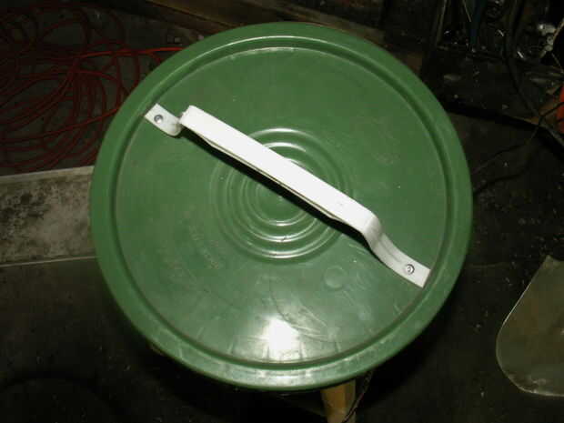 Hay el mango ahora ya salió mi taladro y perforar un agujero en la tapa de la manija y cubo.