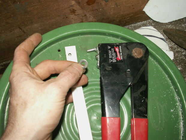 Conectar mediante unos pequeños tornillos y tuercas, pero tuve algunos remaches y una pistola de remache y unas arandelas pequeñas. Esto funcionó muy bien.