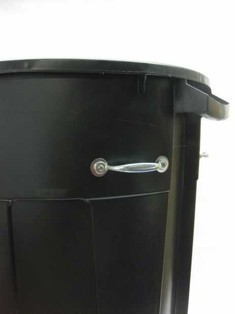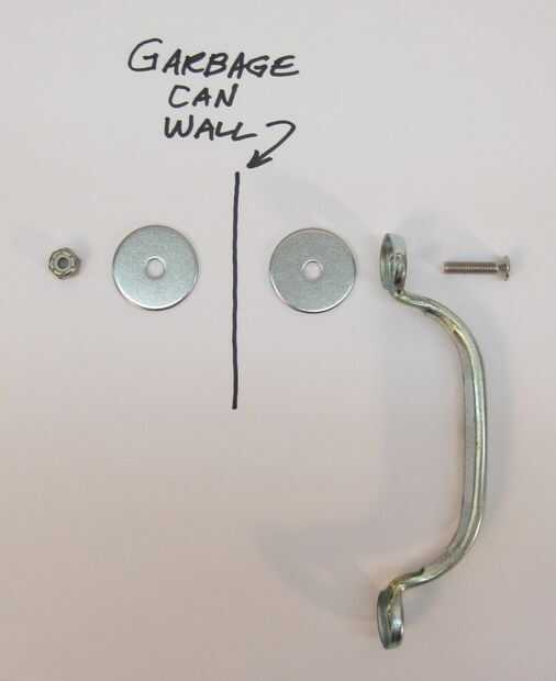 He instalado los tirones en las secciones levantadas de la can que están al lado de las asas de la basura. Los tirones se instalan 5 3/4" de la parte superior de la lata. La lata 1" del borde de la sección y 5 3/4" de la parte superior de la marca. Se trata de la ubicación de la primera perforación para la extracción. Centro un agujero de un tirón sobre esta marca, alinee el tirón horizontalmente y marque la ubicación del segundo agujero. Para hacer esto más fácil, hacer el primer agujero con la 1/4 broca de. Fije sin apretar un lado del tirón a este agujero poner las piezas juntas según el cuadro. Alinee la tracción y marque el segundo agujero. Luego mueve la tracción fuera del camino y taladre el segundo agujero. Terminar colocando el segundo lado del tirón para el segundo agujero.
