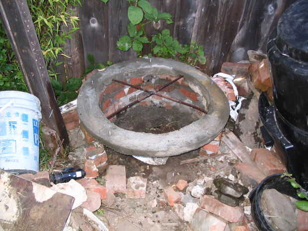 Originalmente hice to anillo en la parte superior de los ladrillos. Tenía 2 barras curvas ronda exterior y refuerzo que cruzó al medio para mantener la pieza de plástico interior caiga. La papelera se estableció en la parte superior y pernos fueron empujados hacia abajo en mojado concretos a través de los orificios en la parte exterior del recipiente para que la papelera sentaría perfectamente cuando creó el anillo. Luego, encontré que podía mover el anillo por mi cuenta.