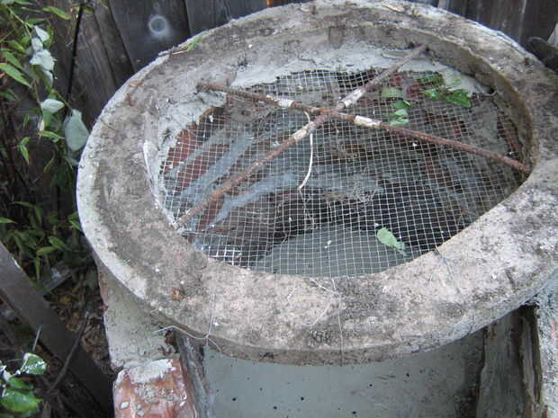 , Una cama de mortero fue puesta encima de la albañilería y la malla añadido, luego otra cama pequeña de mortero en la parte superior y el anillo de hormigón mojado fue colocada en la parte superior. Es importante marcar el anillo para que sepa donde la parte delantera de la compostera a punto y alinear correctamente antes! Tuve que atar el alambre de la malla en la parte delantera del aro y yeso en su lugar.
