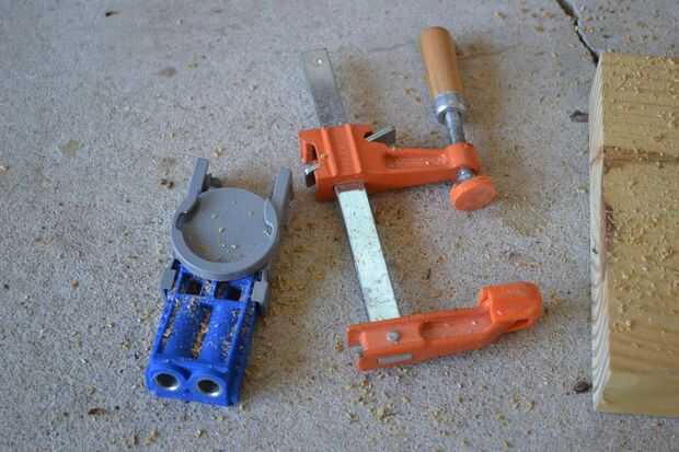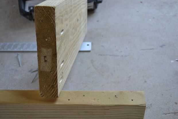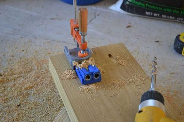 La carpintería para este proyecto se realiza con el tornillo de bolsillos, similar a la fabricación de los muebles. Pretaladrar los bolsillos del tornillo con la plantilla, asegúrese de utilizar el c-clamp para mantenerlo en su lugar. La plantilla que compré vino con un taladro de torcedura y collar metálico utilizado para fijar la profundidad. Usé dos tornillos en cada lado para unir el material de 2 x 8 y un tornillo para unir material de 2 x 4. Estas juntas son sólidas, pero usted puede Agregar pegamento para madera para el seguro.