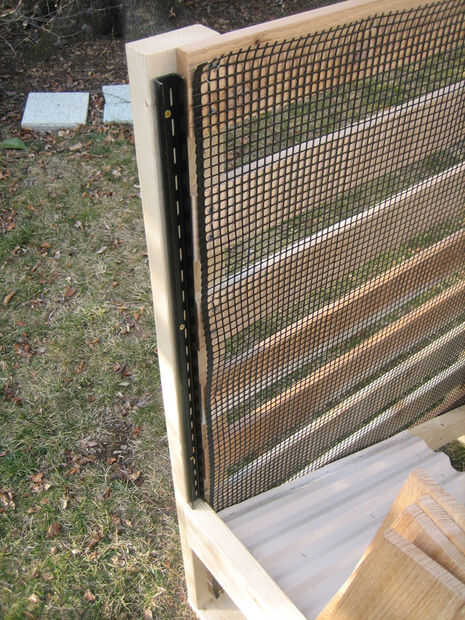 Coloque su galvanizado (o pintadas como se muestra aquí) estantería carril de modo que descanse en la parte superior de la cara de deslizamiento. Marque un punto de aproximadamente 1" debajo de la parte superior del compost bin y corte el carril de la estantería con una sierra en ese momento. Repita para el lado opuesto. Acople de los rieles con los tornillos 1-1/2" exteriores.