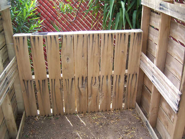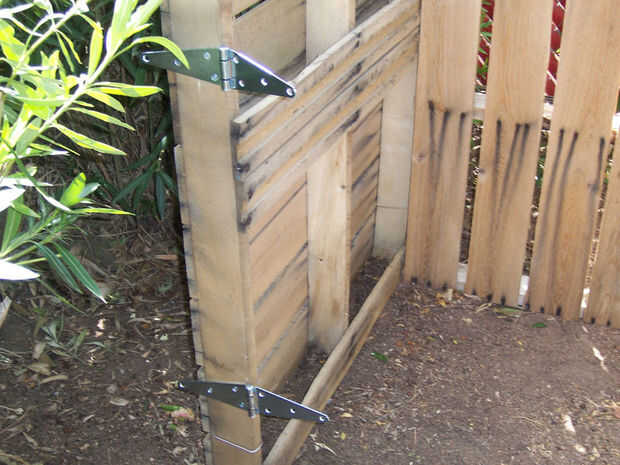 Una vez que haya terminado de atar las paletas juntas. Es hora de añadir las bisagras. Mis bisagras fueron aproximadamente $6,50 desde el depósito. Un poco mejor que constucting alambre bisagras.