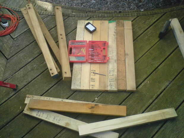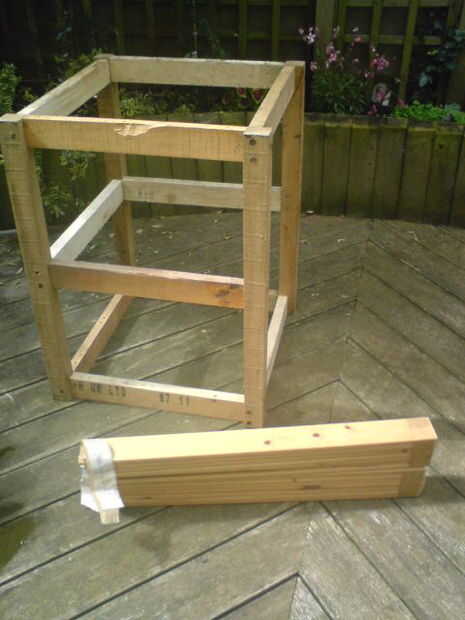 Tuve algunas piezas de sección cuadrada agradable que había acumulado. Éstos se convirtieron en los postes esquineros. Los pedacitos gruesos de los palets se utilizaron como los horizontales: 4 para la parte superior, 4 para la parte inferior y 3 en el medio. Perforé a través de los postes esquineros (se puede ver 2 agujeros fueron compensados de uno a 90 grados en superior, medio e inferior). A través de estos los horizontals estaban atornillados a los postes esquineros.