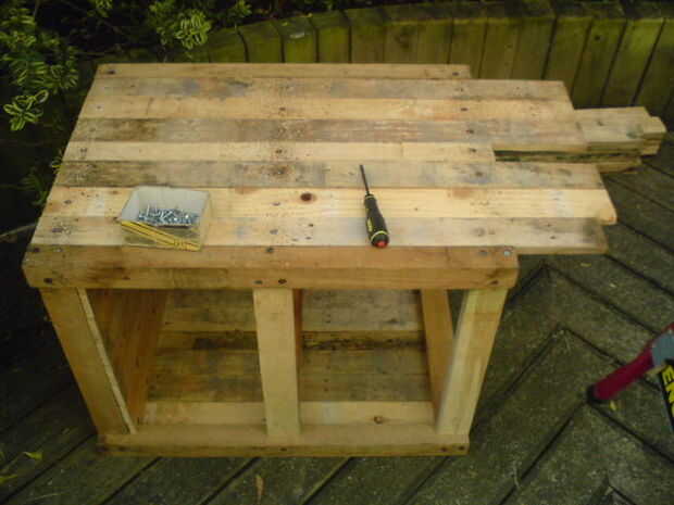 Me taladrar y atornillar las tablas de los palets para hacer los lados. Cortarlas después de instalar para asegurarse de una línea limpia.