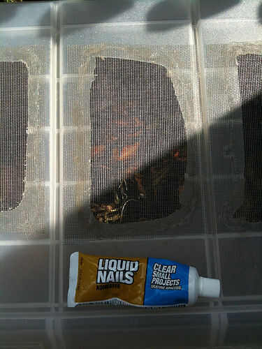 Corte tantos agujeros en el recipiente como quieras pero generalmente cuanto más mejor. Aire es factor importante en un cubo, mantiene a los insectos y ayuda a airea el bin por lo que vas a hacer menos trabajo. Además te huele menos. Después de haber cortado los agujeros de pantalla en el uso de los clavos líquidos. Usé dos hojas de pantalla para los orificios de la parte para que el compost no presiona su salida.