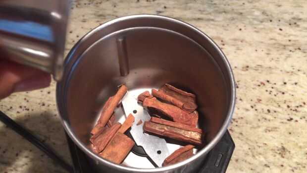 En un molinillo de café o especias, pulverice la canela hasta que quede un polvo fino. Tostar la canela para dar más sabor. Ponga a un lado hasta más tarde.