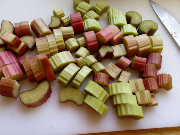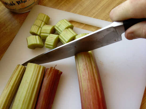Primero lavar los tallos de ruibarbo y cortar cualquier bits frondosos de sus tallos. Escucho que eran venenosas. Luego cortar el ruibarbo en a trozos de tamaño similares. Generalmente hago pedazos sobre un espesor de media pulgada pero realmente cualquier tamaño es semi consistente para que cocine a la misma velocidad todos es necesaria.