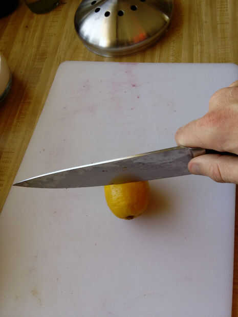 Una vez que el ruibarbo es picado podría sentirse triste que el picado se realiza. Nunca temo todavía hay un limón para cortar por la mitad. Saborear el momento como picar el limón en dos ya que es último chop que la receta.