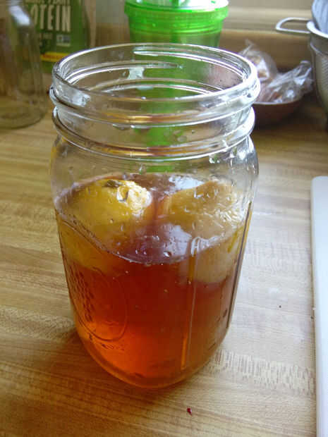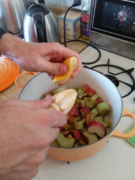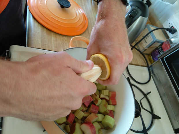 Descarga su ruibarbo picado de precisión en el bote. Luego exprima el jugo de limón en. Si quieres ahora puedes invertir el tiempo para quitar las semillas pero me no molesto nunca. Como un paso opcional puede utilizar las dos mitades de sobras de su limón exprimido en un buen vaso de té de sol. Ahora agregue el agua.