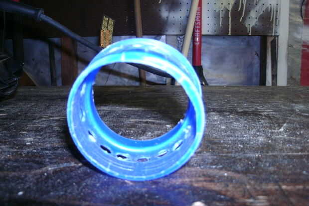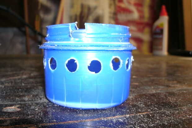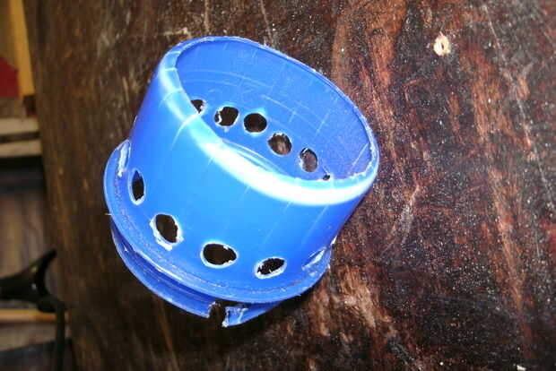 Luego perforé 3/8 agujeros equidistantes alrededor del adaptador. vez el primero de 4 orificios. Todavía a poco flujo. Luego puse 4 más un total de 8 y todavía muy poco flujo. Por último, doble el número de agujeros para el 16 y el flujo era perfecto, no ruidoso zumbido de la aspiradora de taller o sobrecargar el motor.