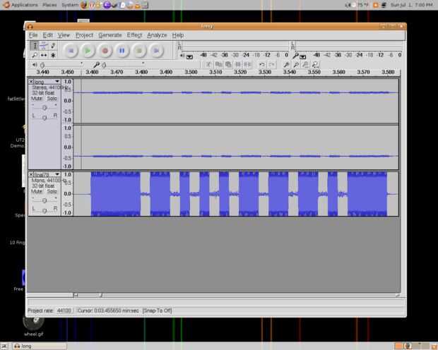 La señal es una señal de 7800 Hz que capturé usando una tarjeta de sonido y una bobina de antena de cable en mi walmart local. Cuando se amplifica puedes ver que pulsos para ciertos períodos de tiempo. La señal de bloqueo se muestra en la imagen. He recreado con una onda cuadrada y había guarda como un archivo mp3. Descargar el archivo (final78.mp3) y ponerlo en su reproductor de mp3.