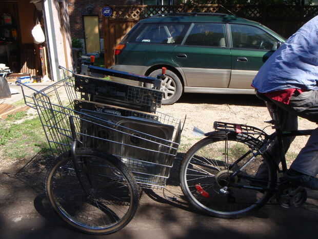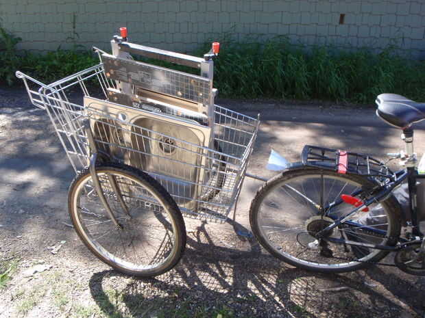 Mi recorrido más grande hasta ahora fue un viaje de Eva de basura particularmente acertado que pescó una vieja cortadora de césped eléctrica más regular y una barra de levantamiento de pesas Olímpico (al parecer este último es de 50 libras). El problema mayor era la longitud de la barra olímpica con el peso cerca de los extremos, pero no demasiado mal trabajó, y sobrevivió a la cesta.