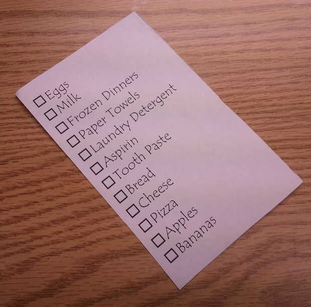 No somos los mejores en poner las listas en orden de ocurrencia del elemento en el almacén.  Como con las familias más ocupadas, nos escriban cosas como pensamos de ellos.  Aquí está una lista impresa de ejemplo para conseguir nosotros empezó.  Sé que la aspirina y la pasta de dientes será lo primero recoger en la tienda (siendo la primera área del ande), pero los artículos están en esta lista.  Aquí viene la técnica de plegado...