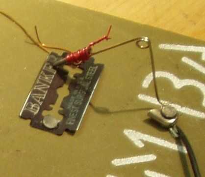 El detector puede ser de una hoja de afeitar azulada y un alfiler, o puede ser un diodo de germanio.  Su propósito es tomar la electricidad de alta frecuencia y convertirla en electricidad de audiofrecuencia que imita el programa original.
