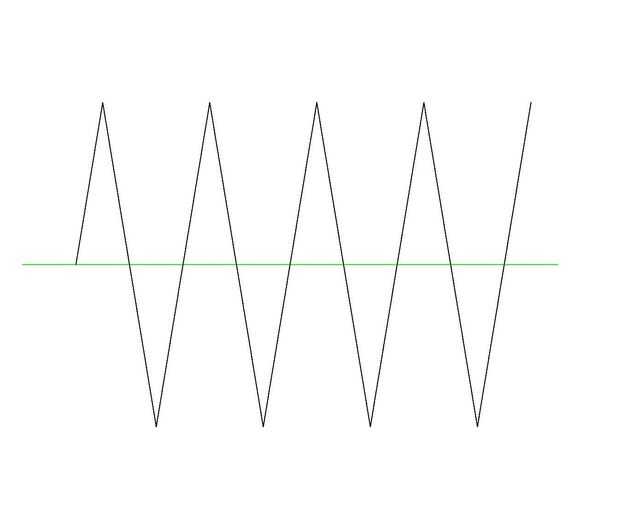 Si escuchas a este no oye nada porque él oscila en 800 mil o tal vez 1700 mil ciclos por segundo.  Es demasiado rápido como para escuchar.  La mayoría de nosotros puede aquí 20 mil ciclos de tal y no más.  Pero esta onda portadora es muy importante para la transmisión de radio.  Es lo que será modulada o en forma de imitar el sonido del programa radio.   La línea horizontal verde representa 0 y la parte superior representa la mayoría positiva y la parte inferior representa más negativo.  Y debe establecerse como una onda senoidal agradable así que esto es sólo un boceto rápido.