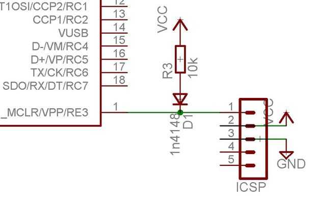 Si un PIC usando MCLR (master clear) debe proporcionar algún voltaje en el pin MCLR a través de una resistencia de 10Kish. Este es también el pin al que se aplicará ~ 13 voltios para entrar en modo programación. Pongo un 1n4148 diodo (equivalente) entre la resistencia y el pin MCLR/Vpp (como se muestra en el esquema y representación más abajo). Esto mantiene el voltaje de programación en el pin Vpp, prevención de la destrucción de otros componentes en su tabla.