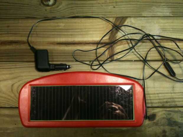 Fui al puerto de carga y tiene un panel solar. Era solamente 15 dólares y vino con su propio construido en regulador del cargador y un enchufe de encendedor.