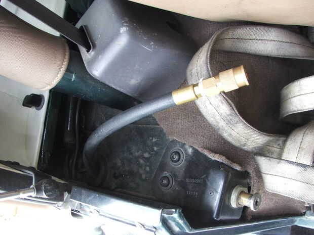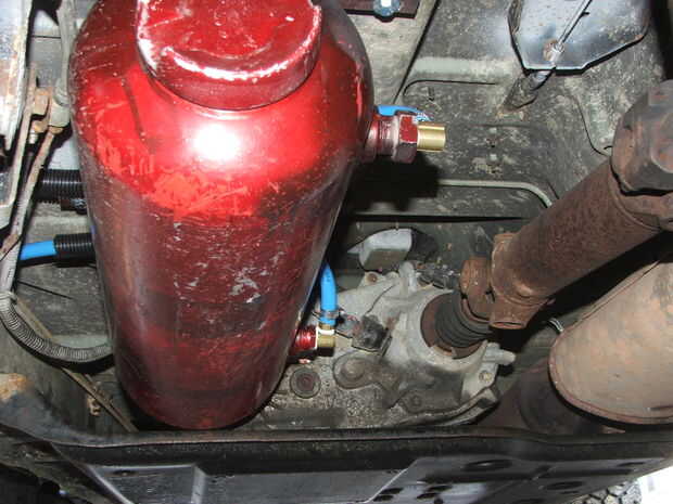 El tanque de aire que elegí es un extintor de incendios de cartucho Ansul Redline viejo el modelo de 30 libras que tengo de una tienda local extintor gratis. Medido su volumen para ser alrededor 6.7gallons. Para fijar el tanque a la jeep que solía 12" secciones de 1" tubo cuadrado que soldado con autógena al lado del tanque. El tanque de Ansul es suficiente que usted no tiene que preocuparse acerca de su resistencia estructural.