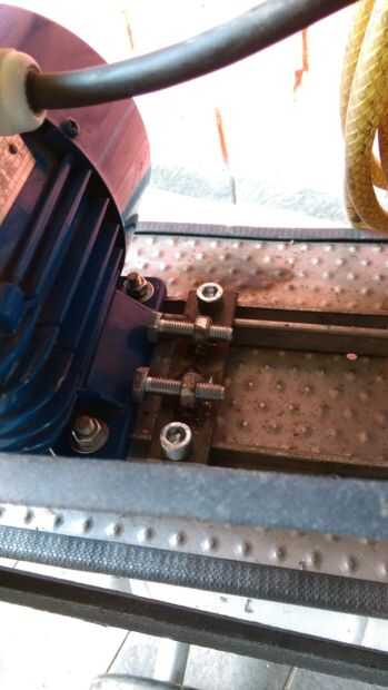 Tomé dos tuercas y soldar con autógena en una pieza de acero. Luego atornillar el dispositivo de frente el motor y gire los dos tornillos contra el motor para estirar la correa.