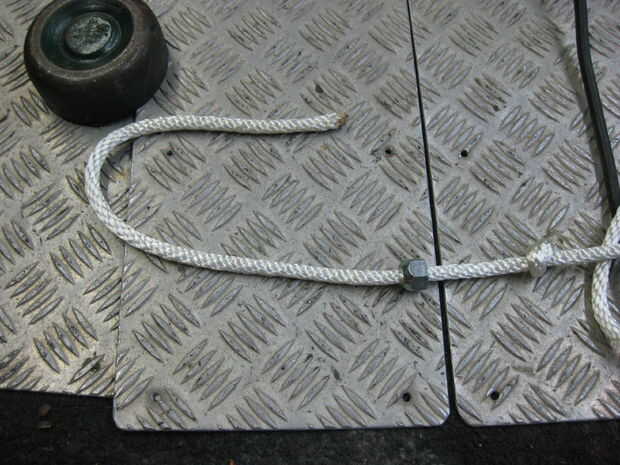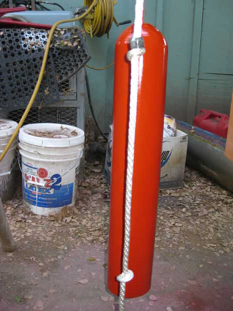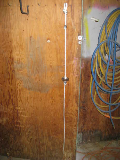 Lo llevó fuera y la sostuvo hasta el tanque haciendo otro nudo cerca de 4 pulgadas desde la parte inferior del tanque. Si vas demasiado la cuerda no tiene suficiente tiro para permitir el badajo tocar los lados antes de que la cuerda en contacto con el labio de la campana.