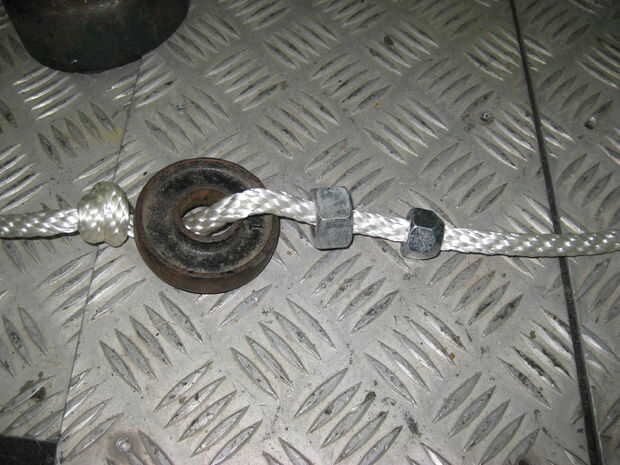 Ató un nudo alrededor de un pie y medio desde la izquierda de la cuerda y luego se deslizó una tuerca a la izquierda del nudo. Usé una vieja tuerca del estirón desde el cono sería el centro de sí mismo en el cuello y darle una mejor caída.