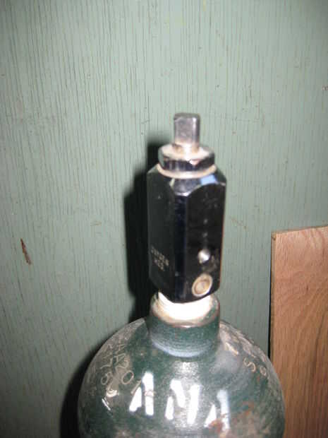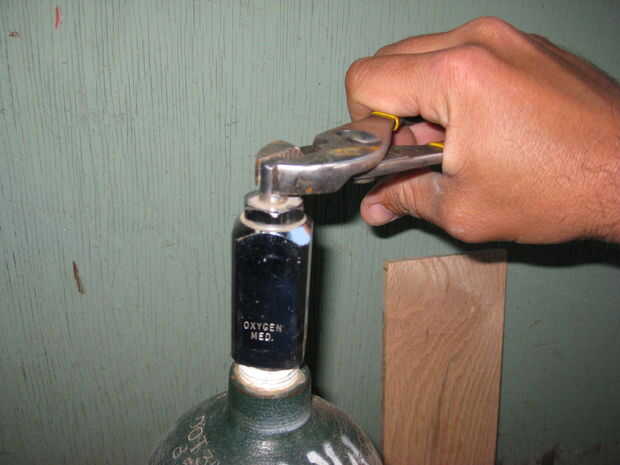 Vaciar el cilindro.  En mi caso fue un viejo tanque de oxígeno y de concepción para hacer realidad el proyecto fue un par de meses. Abrir la válvula para permitir desagüe entonces ponga apagado en una esquina y lo dejó por un tiempo.  Use un par de pinzas para abrir la válvula.  En este punto estaba bastante seguro de que todo el gas había disipado por lo que no estaba demasiado preocupado por el depósito de convertirse en un misil.