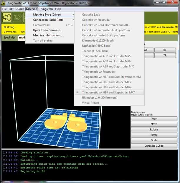5. Verifique para asegurarse de que la máquina correcta es seleccionada bajo la máquina -> controlador ->. La máquina que estaba usando era Thingomatic w/HBP y Stepstruder MK7.