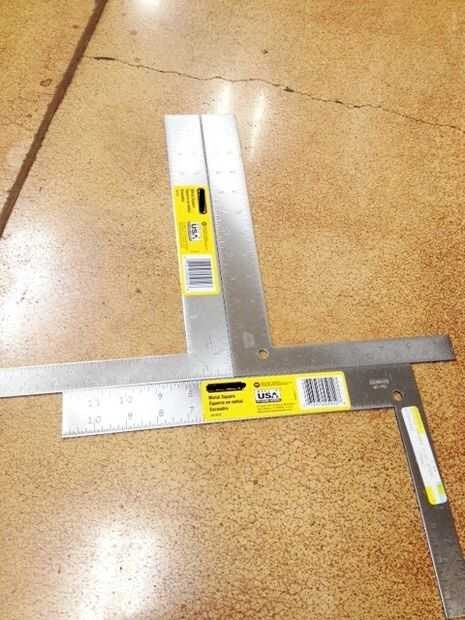 "Dos líneas perpendiculares a la misma línea son paralelas entre sí." es un teorema de geometría de primer año. Nadie me estaba viendo en la tienda, que no sean las cámaras de seguridad, por lo tanto, tiró tres plazas idénticos desde el rack y difunde hacia fuera en el piso. Sus etiquetas no envuelven alrededor de la Plaza, que habría comprometido mi prueba pero las etiquetas sólo fueron pegadas en la superficie de las plazas. Utilicé un cuadrado como una regla. Me deslicé las otras dos plazas contra este lado. Entonces me deslicé hacia los demás. Tuve cuidado para asegurarse de que las plazas se basaba firmemente contra la regla. Si las plazas son muy cuadradas, los bordes verticales deben cumplir a lo largo de su longitud. Notar el espacio entre los bordes donde las dos plazas encuentran, especialmente cómo forma una "V" poco profunda que se vuelve más ancho en la parte superior de la foto. Estas plazas no son cuadradas. Ver la segunda foto de una foto primer plano de la brecha.