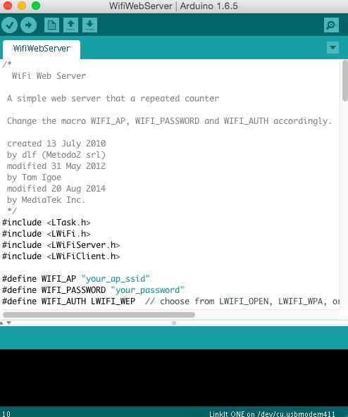 El código para este proyecto se une a esta página. También se puede encontrar bajo los ejemplos de un LinkIt como el código del servidor web WiFi. En la siguiente línea: