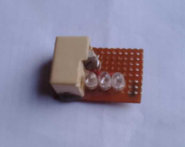 En el otro lado del alambre que hice una pequeña unidad que contiene 3 LEDs para comprobar los 4 hilos del cable de Ethernet. 3 LEDs son de 4 pines (3 pines son + ive, uno para cada LED y 1 pin en tierra-ive, común para cada LED).
