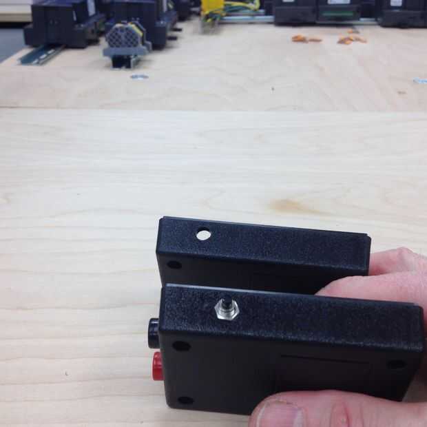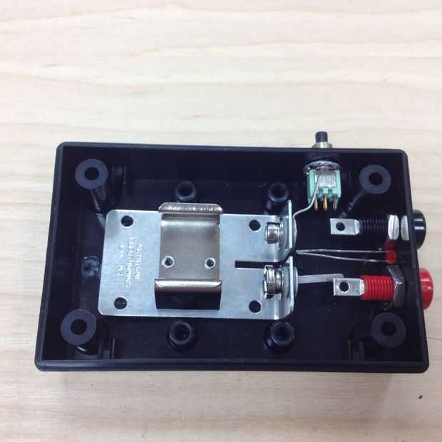 Con una 1/2" broca, perfore dos agujeros en la parte superior de la parte inferior del proyecto de la caja (ver foto arriba) montar la prueba banana rojo y negro gatos (negro sobre el rojo izquierdo, a la derecha cuando se mira desde la parte superior). Estos agujeros son aproximadamente 5/8 en cada lado y 3/8" arriba de la parte inferior de la caja. Puede quitar la tuerca de montaje, coloque los jacks de prueba banana a través de los agujeros y apriete la tuerca en el interior para sujetar los conectores en su lugar. El interruptor también puede montarse en el lado izquierdo de la caja con la arandela en el interior y la tuerca en el exterior.