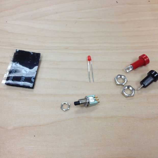 En este paso vamos a taladrar los orificios en el cuadro de proyecto para el interruptor de prueba y banana jacks. También atribuiremos la tira de Velcro para sujetar el clip de la batería de 9V en la parte inferior de la caja del proyecto.