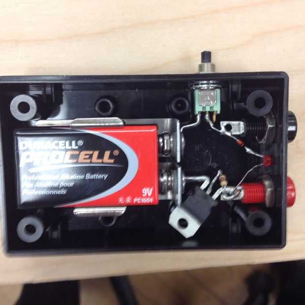 - El componente regulador de voltaje en la caja exactamente como se muestra y el plomo exterior de la soldadura los + 9V lado del clip de la batería como se muestra.