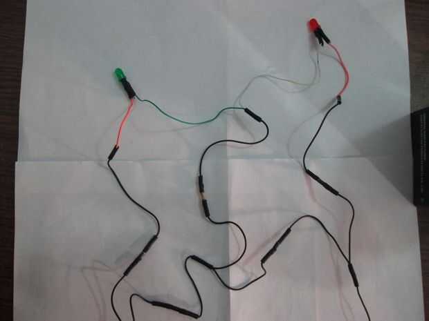 En la figura, R1 representa el resistor de 1K ohmios mientras que el D3, D4, D5 y D6 representan los diodos (1N4007). La D1 y D2 son los LEDs rojo y verdes respectivamente.