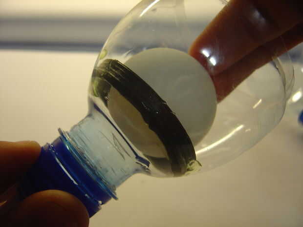 Ahora, tome la junta tórica (de elegir usar uno) y encolarla ti dentro de una bottlr superior. Usted puede presionar hacia abajo con la pelota de tenis de mesa. (Asegúrese de que usted no tiene ninguÌ n pegamento de epoxi en el interior de la junta tórica)