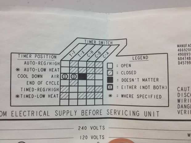 Diagramas de cableado pueden ser bastante confusos, así que por simplicidad me voy centrando en el esquema de interruptor que se incluye en el cableado. Usted notará en este esquema que las posiciones se indican en el lado izquierdo (Auto-Reg/alto, Auto-calor bajo, Timed-Reg/High, Timed-calor bajo). A lo largo de la parte superior, verás dos letras en cada columna. Estas letras indican los terminales de prueba. A la derecha, se dará cuenta de lo que significa cada cuadrícula (apertura del interruptor, interruptor cerrado, etc.).