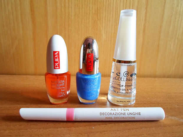 Colores utilizados:Blancanieves Me - colores pecaminosasLimonada - OrlyRosa Blink - Sally HansenCotton Candy - OrlyJewlie caja - Barielle tonosPies descalzos en azul - EssiePepperminty - CiateMigi Nail Art Pen en negroPaso 1: Pintar la base1. pinte u