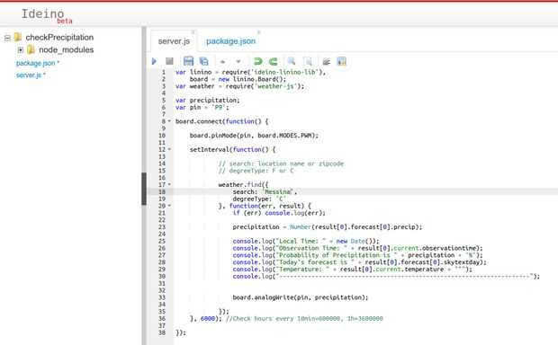 var linino = require('ideino-linino-lib'), board = new linino.Board(); var weather = require('weather-js');var precipitation; var pin = 'P9';board.connect(function() { board.pinMode(pin, board.MODES.PWM); setInterval(function() { // search: location name or zipcode // degreeType: F or C weather.find({ search: 'Messina', degreeType: 'C' }, function(err, result) { if (err) console.log(err); precipitation = Number(result[0].forecast[0].precip); console.log("Local Time: " + new Date()); console.log("Observation Time: " + result[0].current.observationtime); console.log("Probability of Precipitation is " + precipitation + '%'); console.log("Today's forecast is " + result[0].forecast[0].skytextday); console.log("Temperature: " + result[0].current.temperature + "°"); console.log("----------------------------------------------------------------------"); board.analogWrite(pin, precipitation); }); }, 3600000); //Check hours every hour. 1h=3600000})
