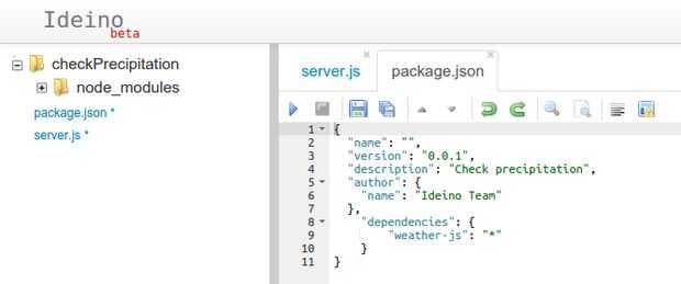Cree un nuevo proyecto en el IDE Ideino, elija nombre y modificar los archivos package.json y server.js como sigue: