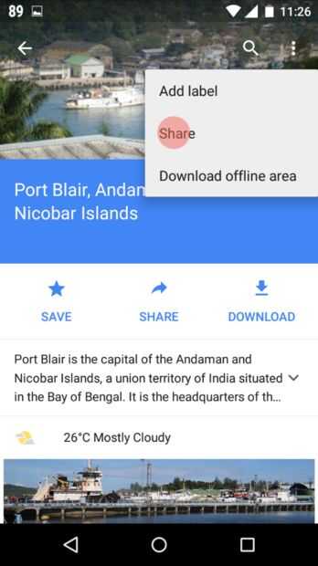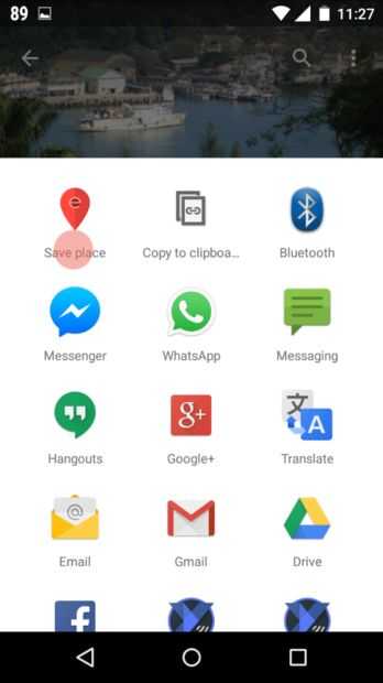 Después de seleccionar su destino en la aplicación de mapas, haga clic en el icono de menú lista en la esquina superior derecha. Haga clic en la opción de compartir en el menú de lista. Esto hará que aparezca una lista de todas las apps que puede recibir la acción de compartir de google mapas de aprox. Seleccione el icono marcador de ubicación geo como guardar lugar.