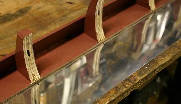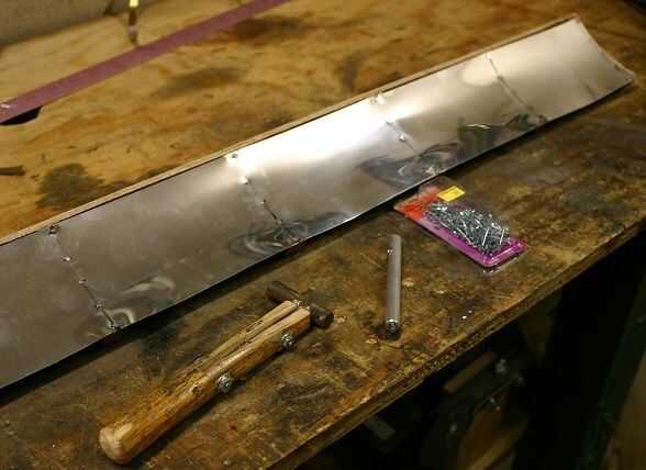 También le cuenta que la hoja de aluminio tiende a relajarse hacia el "exterior" - es decir, para ser una hoja plana otra vez - de las costillas. Probablemente, un conjunto de soportes longitudinales, al ras con la parte interna de las costillas, sería la mejor manera de solucionar esto... pero sería difícil de hacer sin recurrir a componentes de corte por láser.