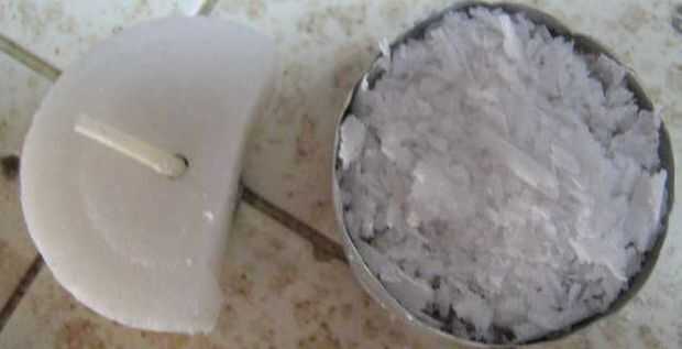 2. Pedazos de cera de la vela de tealight de la viruta sobre el polvo con un cuchillo.