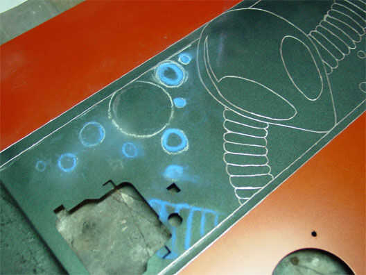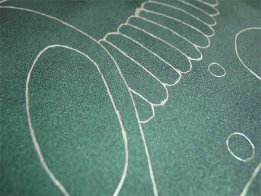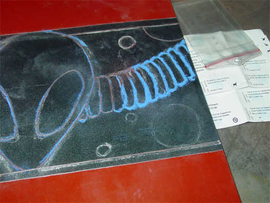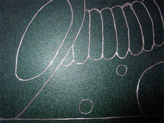Grabar la silueta hecha con tiza. Para hacerlo más fácil, utilicé tiza azul para dibujar sobre lo que aún necesitaba para grabar, porque la tiza blanca era confuso. También lavé el área con windex y una toalla que ya grabado.