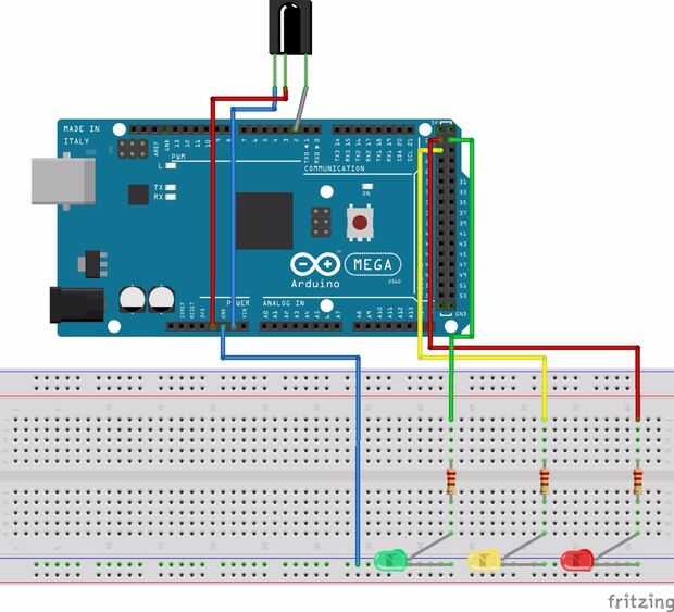 Ahora conectar el LED al arduino. El LED rojo está conectado al pin 22, el LED verde está conectado al pin de 23 y el LED amarillo se conecta al pin 24.