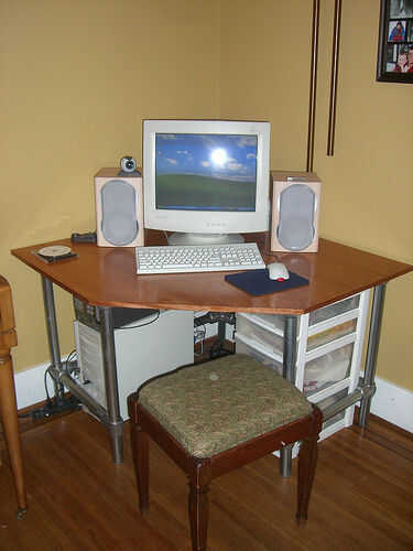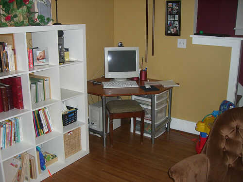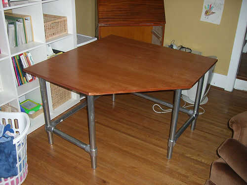 Tenía un viejo escritorio de Ikea con un acabado cerezo intenso, que aunque muy fuerte y útil añadido demasiado color a mi oficina ya marrón. Sabiendo que intentar pintar sería un lío y no resultan en una superficie bastante resistente, opté por volv