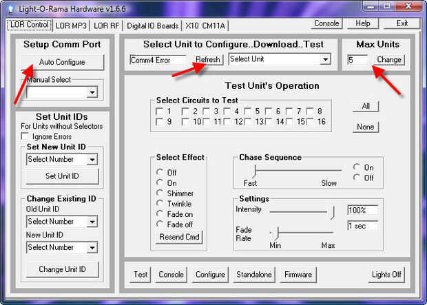 La utilidad de Hardware, haga clic en configurar el Auto en la esquina superior izquierda. Suponiendo que la unidad está encendida y correctamente, la utilidad de hardware debe detectar y configurar el puerto com adecuado. Si no es así, consulte la documentación de instalación que vino con para obtener asistencia. Una vez que se ha detectado el puerto com, cambiar las unidades de máximo en la esquina superior derecha a 5, a menos que tenga controladores de más de 5. Luego haga clic en actualizar en el centro en la parte superior y se detecta la unidad. Jugar con los controles en la ventana del centro para ver las diferentes opciones de luz. Como encenderán las luces, está todo listo para empezar a programar!